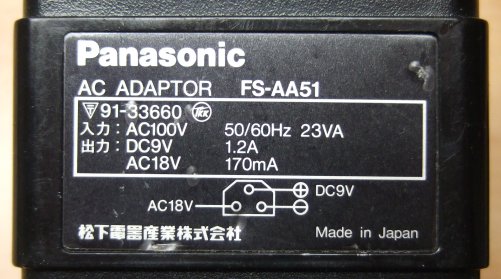右端に見えるACアダプタのコネクタは3端子で特殊な形状。嵌合するコネクタ単体での入手はほぼ不可能のようだ。 全く同じ仕様のACアダプタがFS-A1mk2、SONYのHB-F1でも使われており、互換性はある模様。 |